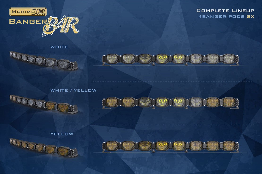 OFF-ROAD REINVENTED: Since 2008, Morimoto has been building the best lighting upgrades for the automotive aftermarket... consistently turning out products packed with more performance, reliability, and best in-class fitment & style. The Double row BangerBar continues that tradition as a bespoke light bar, where you spec the power. You spec the color. You spec the length. You set the radius. And then you destroy the darkness. Every bar is pre-spec'd with the 4Banger Pods, the inner links, a set of universal end-mounts, and all the hardware necessary to assemble.