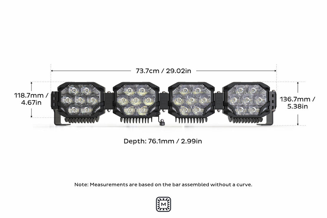 OFF-ROAD REINVENTED: Since 2008, Morimoto has been building the best lighting upgrades for the automotive aftermarket... Consistently turning out products packed with more performance, reliability, and best in-class fitment & style. The triple row BangerBar continues that tradition as a bespoke light bar, where you spec the power. You spec the color. You spec the length. You set the radius. And then you destroy the darkness. Every bar is pre-spec'd with the BigBanger Pods, the inner links, a set of universal end-mounts, and all the hardware necessary to assemble.