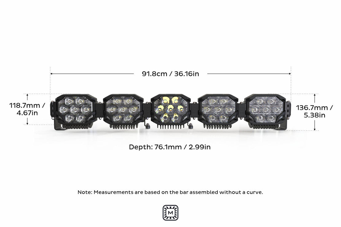 OFF-ROAD REINVENTED: Since 2008, Morimoto has been building the best lighting upgrades for the automotive aftermarket... Consistently turning out products packed with more performance, reliability, and best in-class fitment & style. The triple row BangerBar continues that tradition as a bespoke light bar, where you spec the power. You spec the color. You spec the length. You set the radius. And then you destroy the darkness. Every bar is pre-spec'd with the BigBanger Pods, the inner links, a set of universal end-mounts, and all the hardware necessary to assemble.